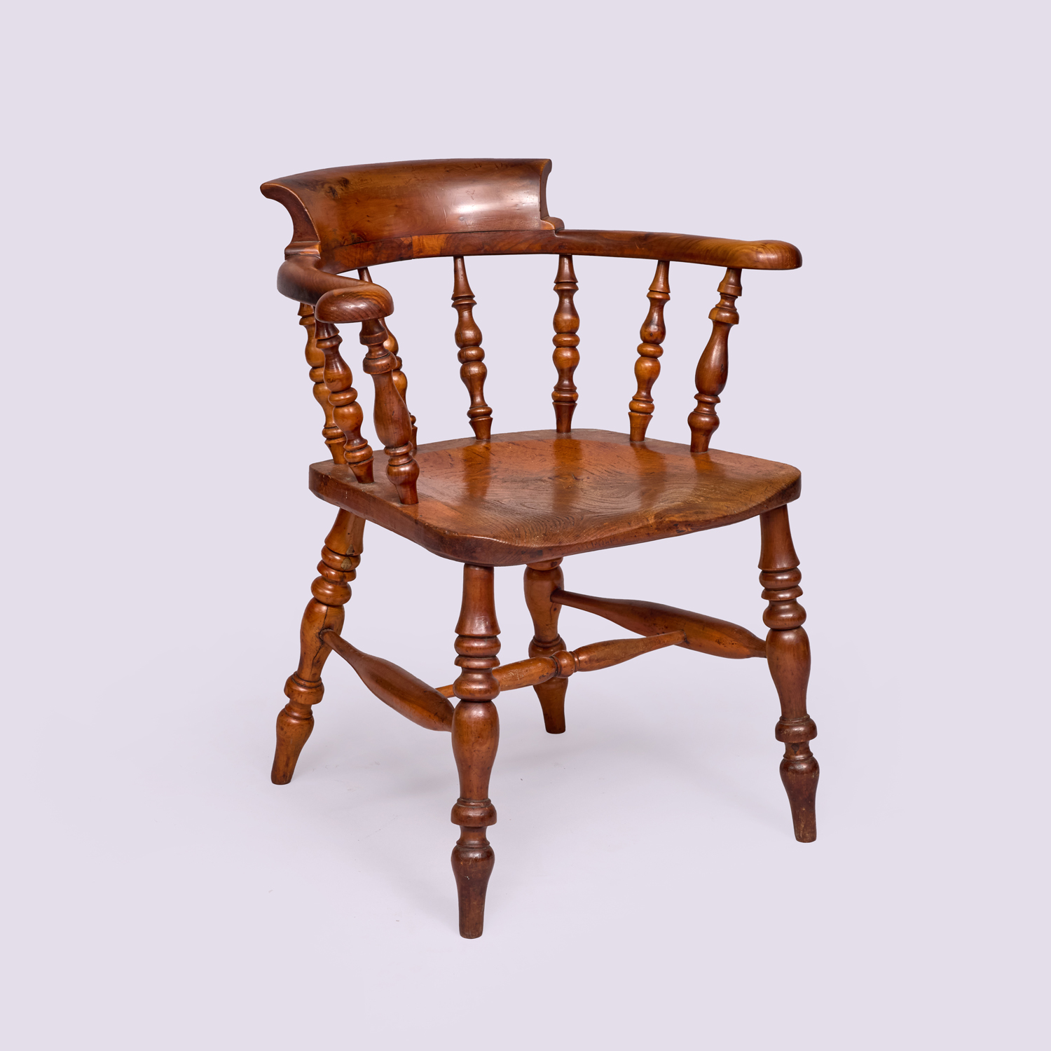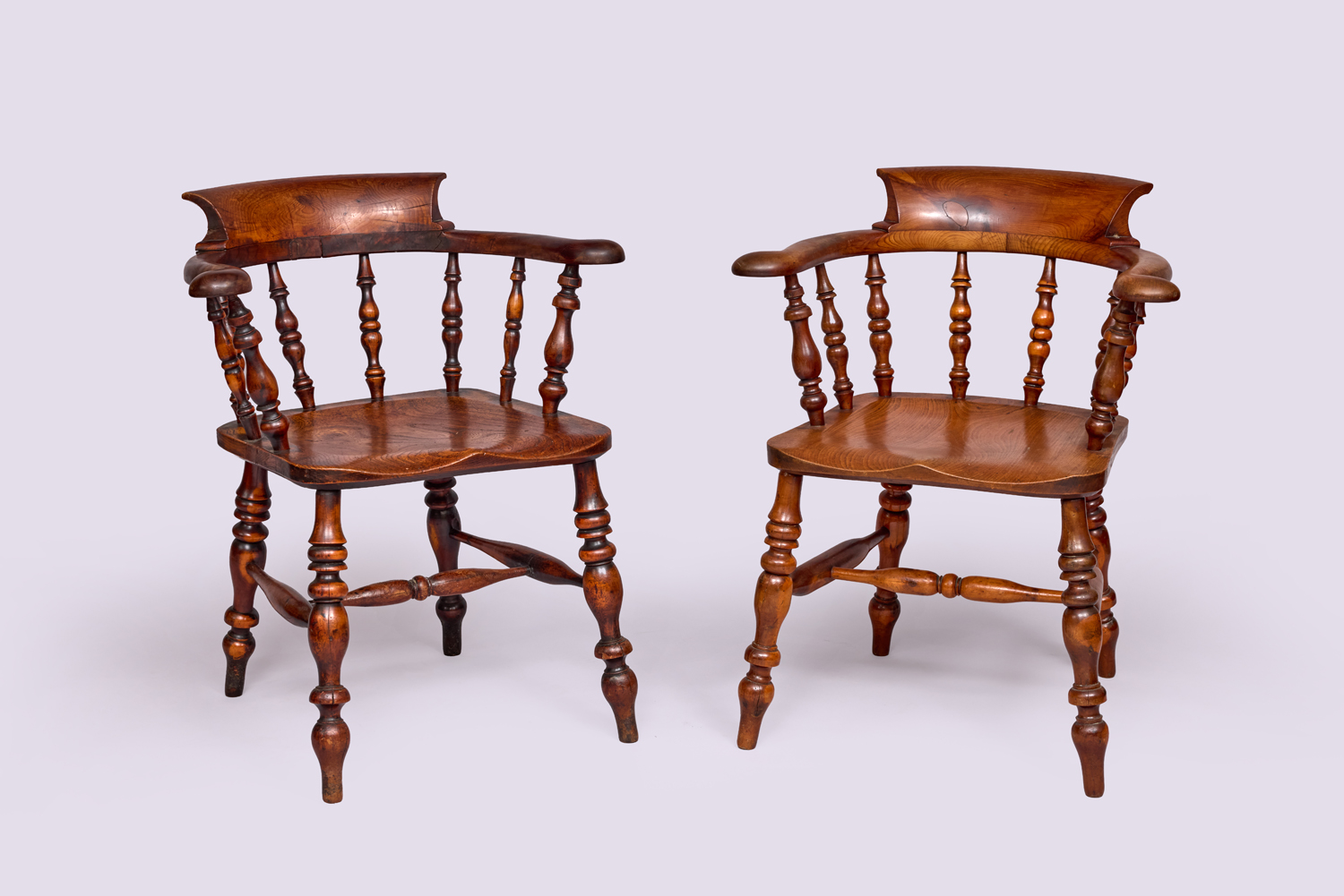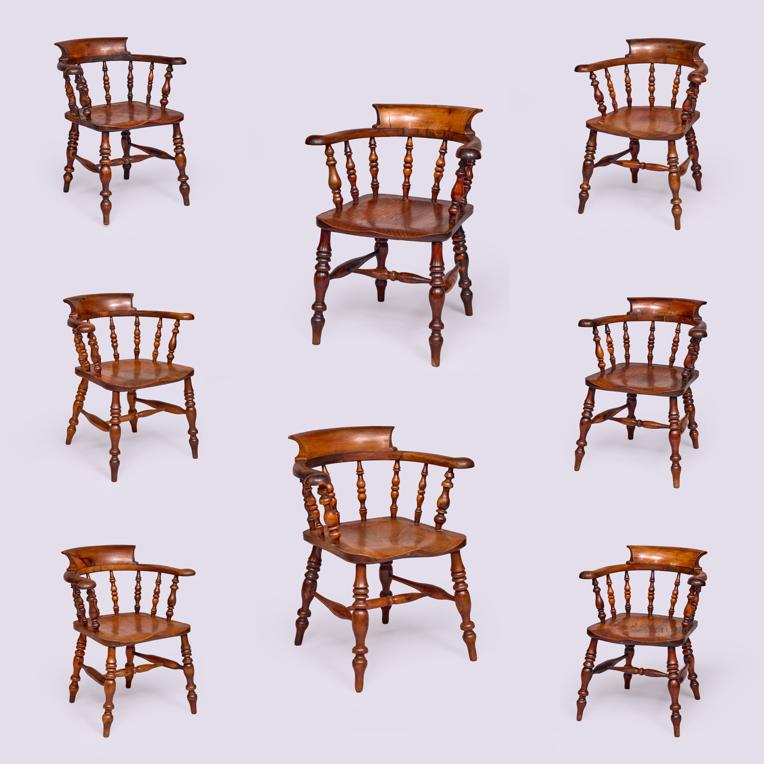 A Harlequin set of eight 19th-century yew tree smokers’ bow Windsor chairs. Raised on turned legs with H stretches above a saddle-shaped ash seat. Eight spindle turnings support the broad arms below a deep bow-shaped backrest.